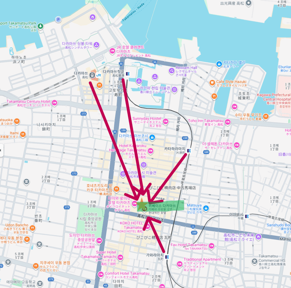 가와라마치역과 도보로 5분 정도걸린다 다카마쓰 중심 상가 근처와 도보로 다카마쓰 항도 이동가능 15분정도 걸린다. 나는 이 숙소에 머물면서 지하철이나 버스를 한번도 이용해 본 적이 없다. 나오시마에 갈때도 도보로 다카마쓰항까지 걸어갔다.