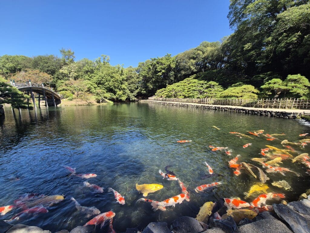 아침부터 일본최대의 공원 리쓰린 공원에서 여유롭게 산책하면서 물고기 밥 줄 예정