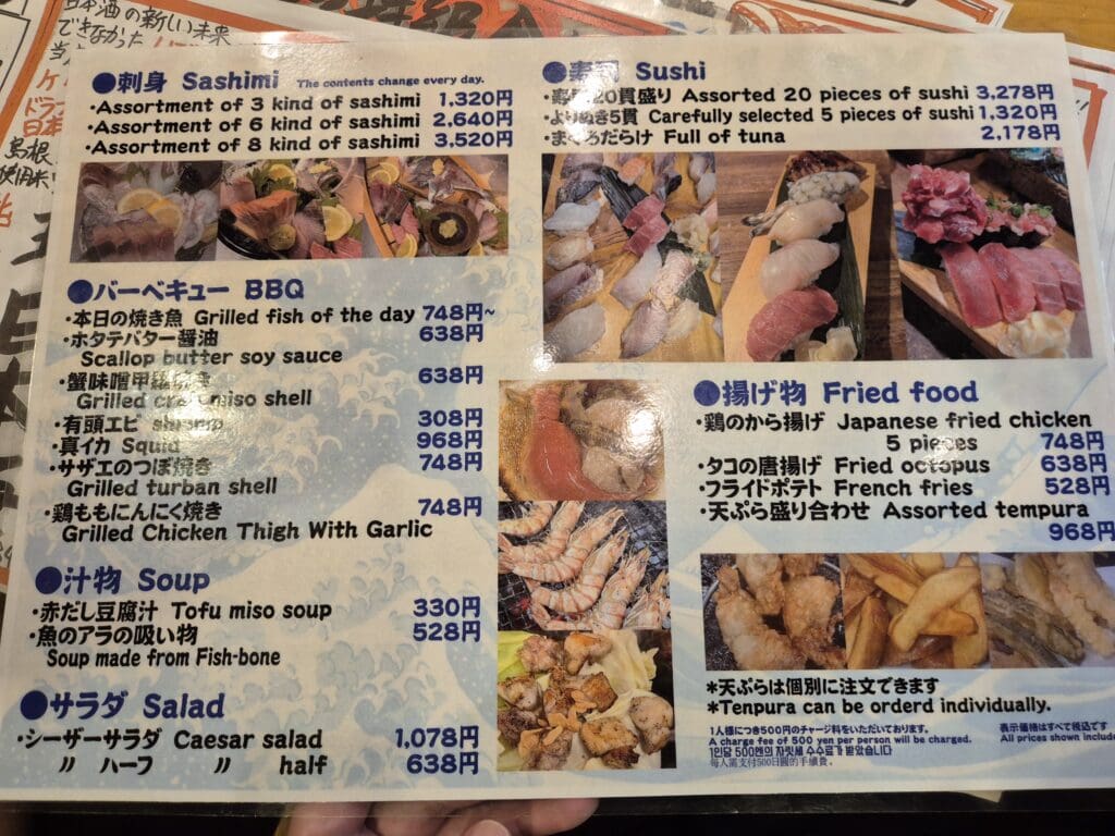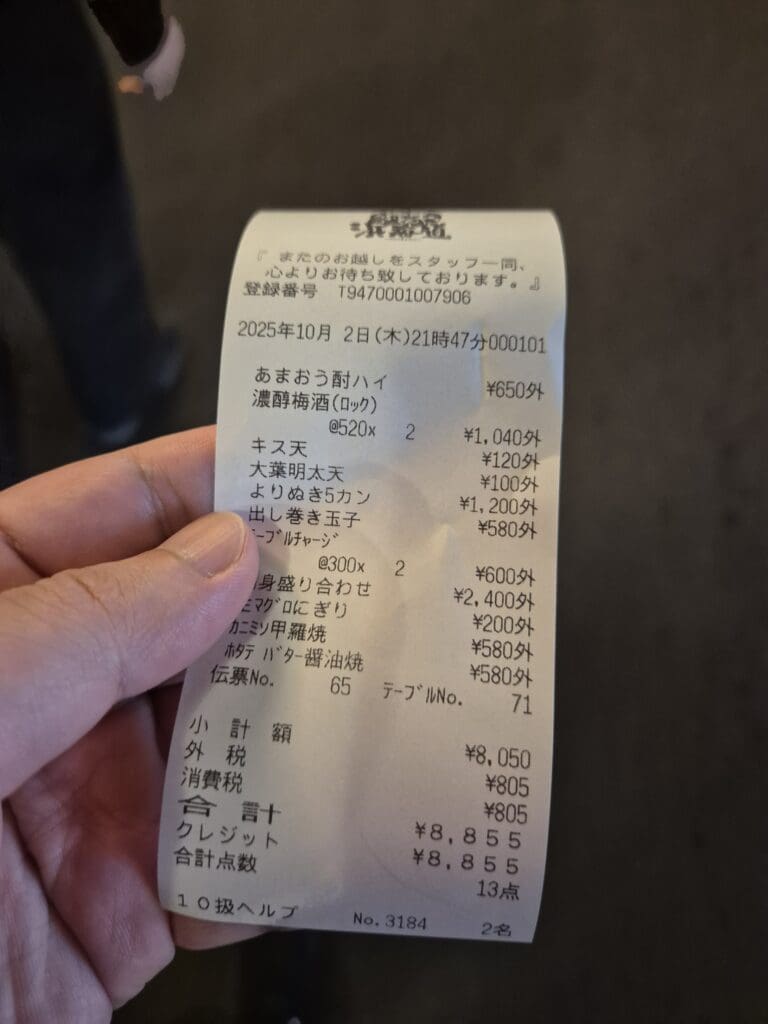 둘이서 메뉴도 엄청나게 주문하고 술도 마시고 했지만,이정도의 사시미와 초밥 게 가리비 등을 먹고 80000원 남짓 나왔다. 이건 믿을 수 없다. 나오면서 절하고 싶었다. 해물 우마이몬야 하마카이도